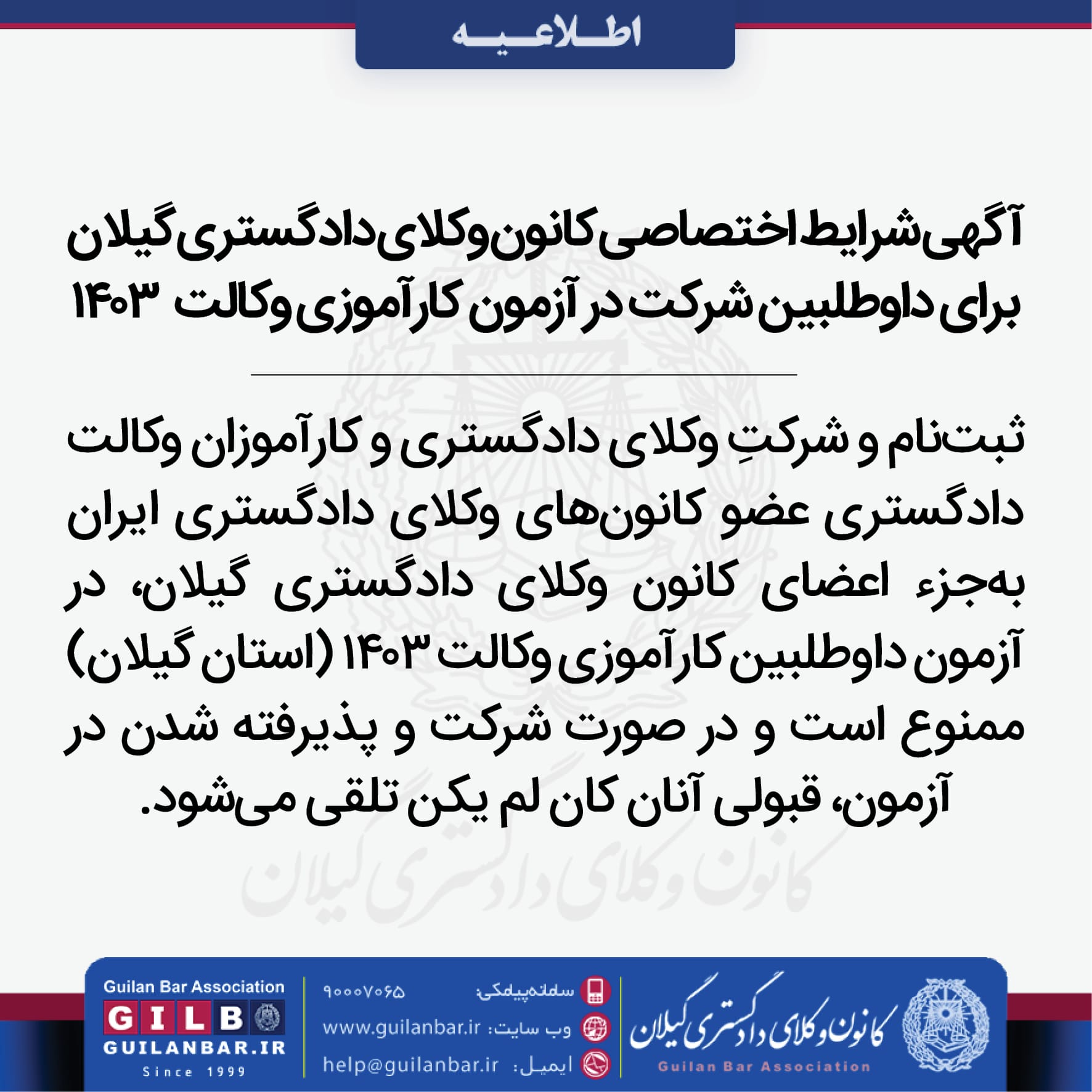 ثبتنام و شرکتِ وکلای دادگستری و کارآموزان وکالت دادگستری عضو کانونهای وکلای دادگستری ایران بهجزء اعضای کانون وکلای دادگستری گیلان، در آزمون داوطلبین کارآموزی وکالت ۱۴۰۳ (استان گیلان) ممنوع است و در صورت شرکت و پذیرفته شدن در آزمون، قبولی آنان کان لم یکن تلقی میشود.