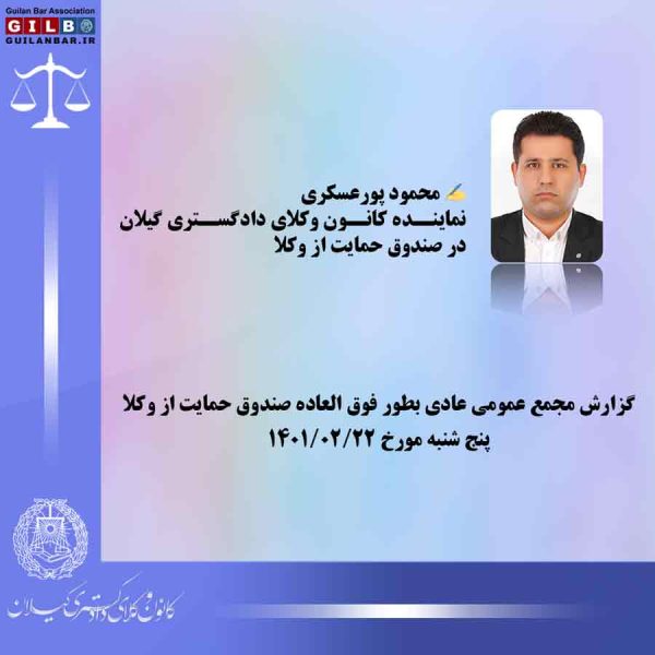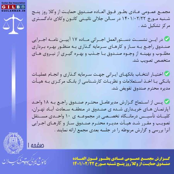 گزارش مجمع عمومی عادی بطور فوق العاده صندوق حمایت از وکلا روز پنج شنبه مورخ ۱۴۰۱/۰۲/۲۲