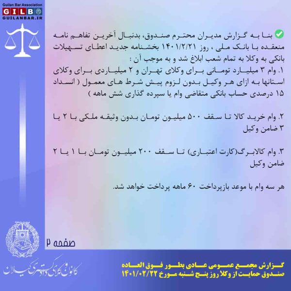 ✅ بنا به گزارش مدیران محترم صندوق، بدنبال آخرین تفاهم نامه منعقده با بانک ملی ، روز ۱۴۰۱/۲/۲۱ بخشنامه جدید اعطای تسهیلات بانکی به وکلا به تمام شعب ابلاغ شد و به موجب آن :