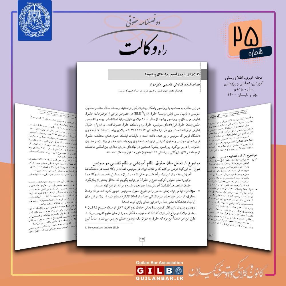 در این مطلب به مصاحبه با پروفسور پاسکال پیشونا، یکی از اساتید برجستۀ حال حاضر حقوق سوئیس و نایبرئیس فعلی مؤسسۀ حقوق اروپا (ELI) در خصوص برخی از موضوعات حقوق تطبیقی میپردازیم. پروفسور پیشونا از سال ۲۰۰۰ میلادی دارای مرتبۀ استادتمامی بوده و تخصص علمی ایشان حقوق قراردادهای سوئیس، حقوق روم باستان، حقوق مصرفکننده در اروپا و حقوق تطبیقی قراردادها است. وی در بازۀ سالهای ۲۰۱۴ تا ۲۰۱۷ میلادی ریاست دانشکدۀ حقوق دانشگاه فریبورگ سوئیس را بر عهده داشته است و تألیفات ایشان حوزههای مختلف حقوق قراردادهای سوئیس و حقوق تطبیقی قراردادها، حقوق روم باستان، حقوق رقابت، و حقوق خانواده را در بر میگیرد. پروفسور پیشونا همچنین در نهادهای داوری تجاری بینالمللی مختلف ازجمله در اتاق بازرگانی بینالمللی ICC بهعنوان داور مشغول به فعالیت هستند.
