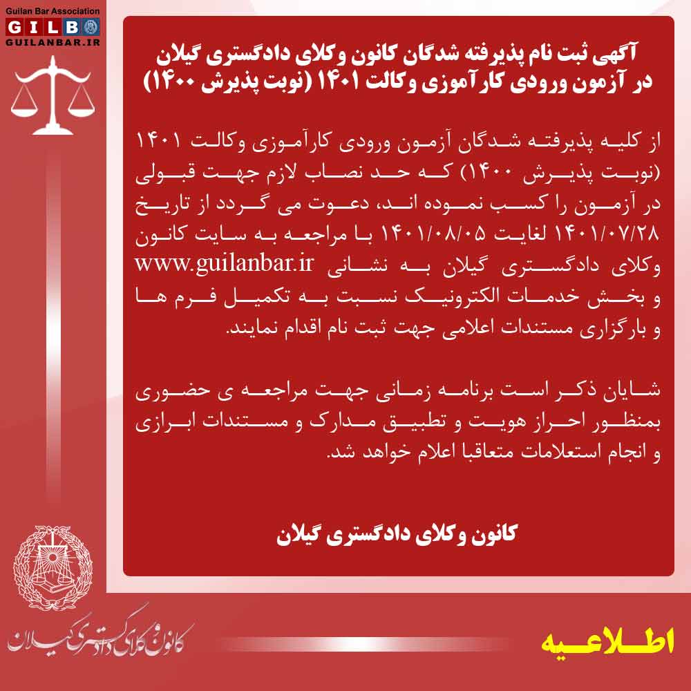 از کلیه پذیرفته شدگان آزمون ورودی کارآموزی وکالت ۱۴۰۱ (نوبت پذیرش ۱۴۰۰) که حد نصاب لازم جهت قبولی در آزمون را کسب نموده اند، دعوت می گردد از تاریخ ۱۴۰۱/۰۷/۲۸ لغایت ۱۴۰۱/۰۸/۰۵ با مراجعه به سایت کانون وکلای دادگستری گیلان به نشانی www.guilanbar.ir و بخش خدمات الکترونیک نسبت به تکمیل فرم ها و بارگزاری مستندات اعلامی جهت ثبت نام اقدام نمایند.