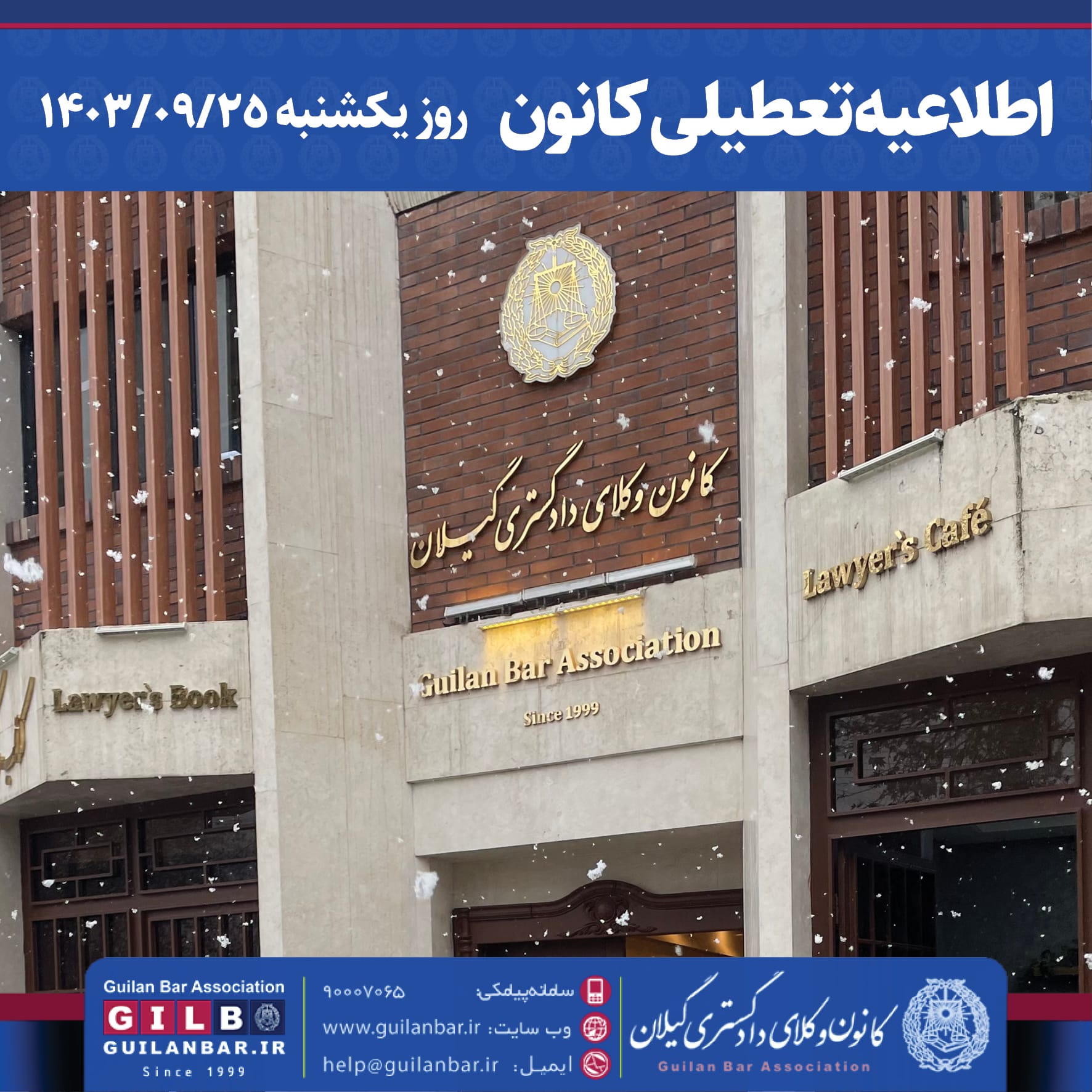 با توجه به اعلام استانداری گیلان و بنابر پیش بینی سازمان هواشناسی و سرمای شدید هوا و یخبندان، کانون وکلای دادگستری گیلان در روز یکشنبه ۲۵ آذر ۱۴۰۳ تعطیل میباشد.