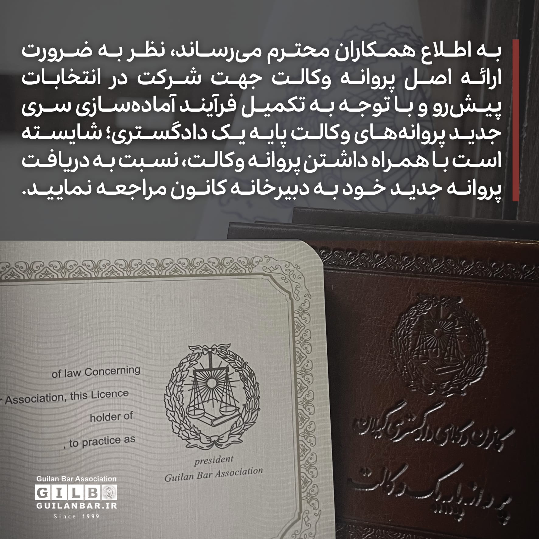 به اطلاع همکاران محترم میرساند، نظر به ضرورت ارائه اصل پروانه وکالت جهت شرکت در انتخابات پیش رو و با توجه به تکمیل فرآیند آمادهسازی سری جدید پروانههای وکالت پایه یک دادگستری؛ شایسته است با همراه داشتن پروانه وکالت، نسبت به دریافت پروانه جدید خود به دبیرخانه کانون مراجعه نمایید.