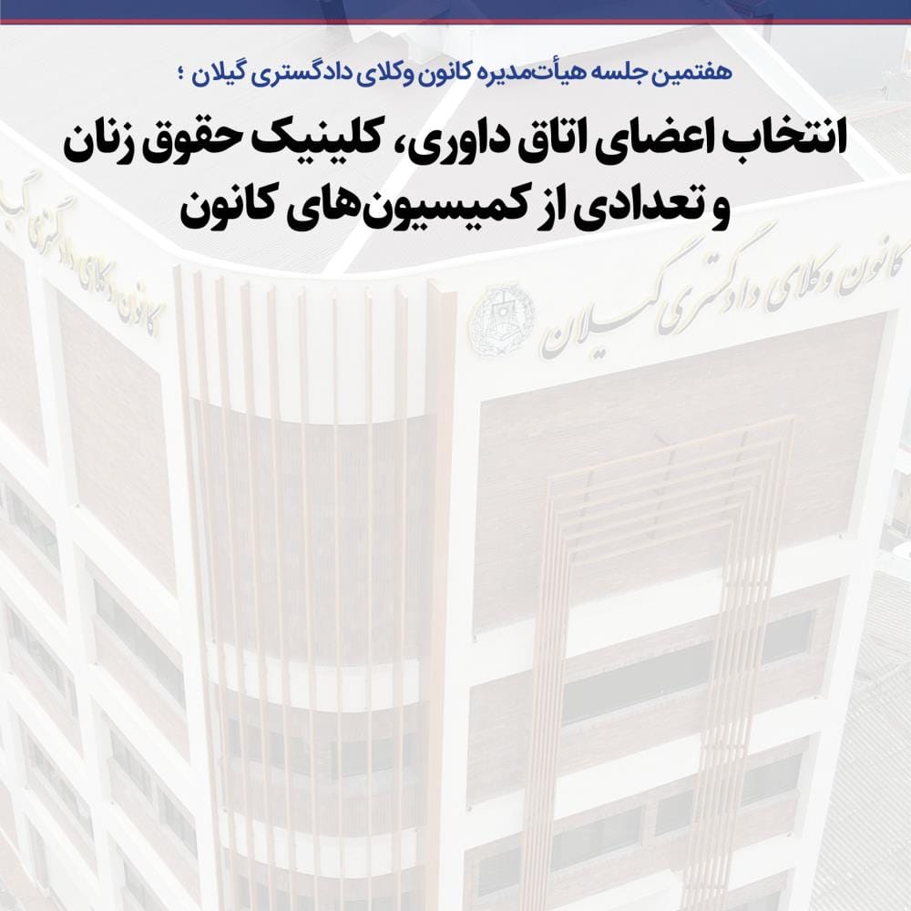 هفتمین جلسه سیزدهمین دوره هیأتمدیره کانون وکلای دادگستری گیلان در محل کانون تشکیل و پس از بحث و تبادلنظر در خصوص موارد ذیل اتخاذ تصمیم به عمل آمد؛