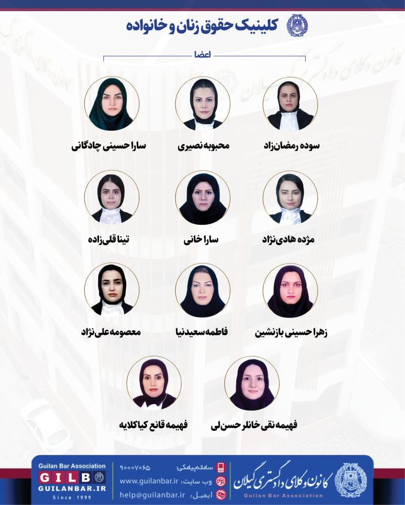 – در خصوص کلینیک حقوق زنان و خانواده خانم‌ها سوده رمضان‌زاد، محبوبه نصیری، سیده سارا حسینی چادگانی، مژده هادی‌نژاد، سارا خانی، تینا قلی‌زاده، زهرا حسینی بازنشین، سیده فاطمه سعید‌نیا، معصومه علی‌نژاد، فهیمه نقی خانلر حسن‌لی و فهیمه قانع کیاکلایه انتخاب و تعیین گردیدند.