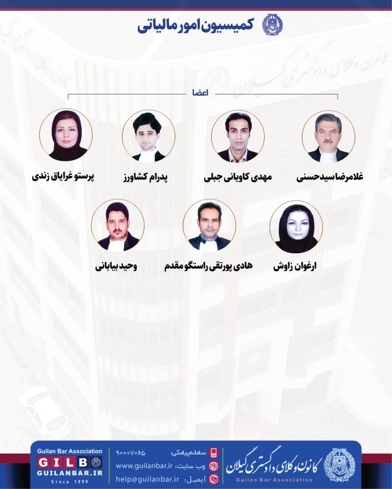در خصوص کمیسیون امور مالیاتی آقایان سید غلامرضا سیدحسنی، مهدی کاویانی جبلی، پدرام کشاورز، هادی پورتقی راستگو مقدم، وحید بیابانی و خانم‌ها ارغوان زاوش و پرستو غرایاق زندی انتخاب و تعیین گردیدند.