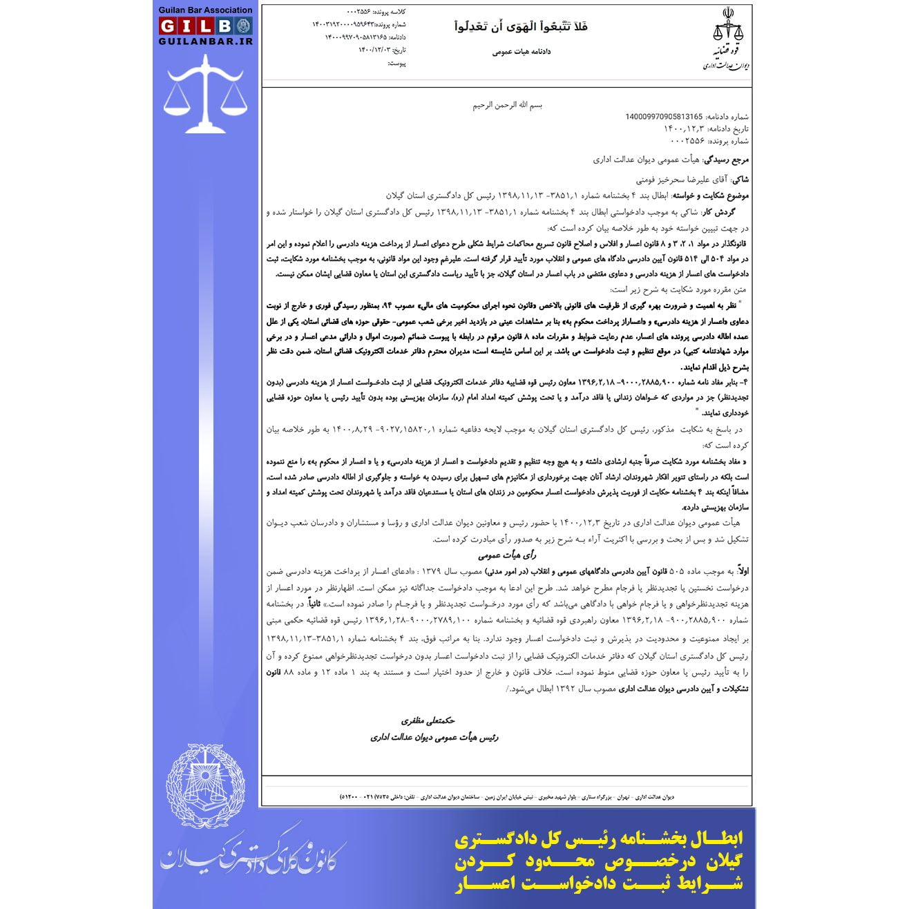 🔸قسمتی از بخشنامه سال ۱۳۹۸ رئیس کل دادگستری استان گیلان که دفاتر خدمات الکترونیک قضایی را از ثبت دادخواست اعسار بدون درخواست تجدیدنظرخواهی ممنوع کرده و آن را به تایید رئیس یا معاون حوزه قضایی منوط نموده بود، با شکایت علیرضا سحرخیز وکیل عضو کانون وکلای دادگستری گیلان، در هیات عمومی دیوان عدالت اداری ابطال شد.
