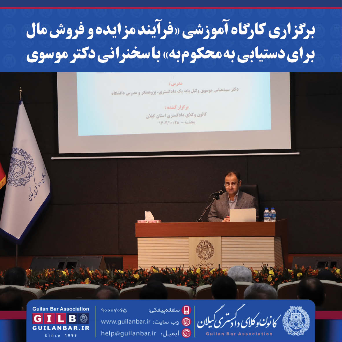 به همت کمیسیون آموزش کانون وکلای دادگستری گیلان کارگاه آموزشی «فرآیند مزایده و فروش مال برای دستیابی به محکوم به» با سخنرانی دکتر سیدعباس موسوی وکیل پایه یک دادگستری و قاضی پیشین دیوان عالی کشور در سالن همایش کانون وکلای دادگستری گیلان برگزار شد.