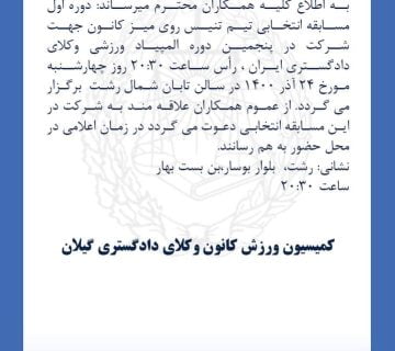 شایان ذکر است چهارمین دوره المپیاد ورزشی وکلای دادگستری سراسر کشور نیز در سه رشته ورزشی فوتسال ، والیبال و تنیس روی میز برای آقایان و والیبال برای بانوان ، بهمن ماه ۱۳۹۸ به میزبانی کانون وکلای گیلان برگزار شد.