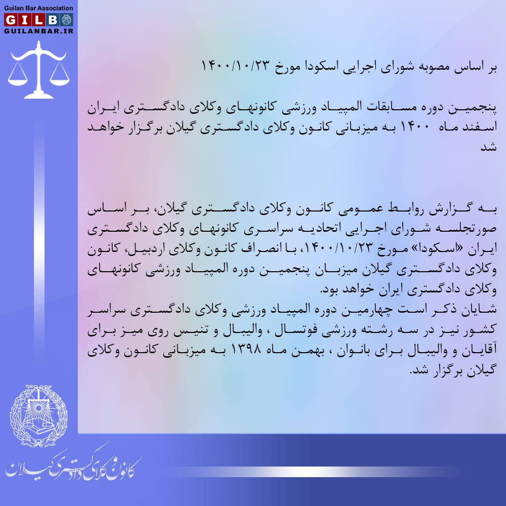 به گزارش روابط عمومی کانون وکلای دادگستری گیلان، بر اساس صورتجلسه شورای اجرایی اتحادیه سراسری کانونهای وکلای دادگستری ایران «اسکودا» مورخ ۱۴۰۰/۱۰/۲۳، با انصراف کانون وکلای اردبیل، کانون وکلای دادگستری گیلان میزبان پنجمین دوره المپیاد ورزشی کانونهای وکلای دادگستری ایران خواهد بود.