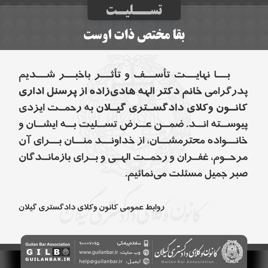 با نهایت تأسف و تأثر باخبر شدیم پدر گرامی خانم دکتر الهه هادیزاده از پرسنل اداری کانون وکلای دادگستری گیلان به رحمت ایزدی پیوسته اند. ضمن عرض تسلیت به ایشان و خانواده محترمشان، از خداوند منان برای آن مرحوم، غفران و رحمت الهی و برای بازماندگان صبر جمیل مسئلت مینمائیم.
