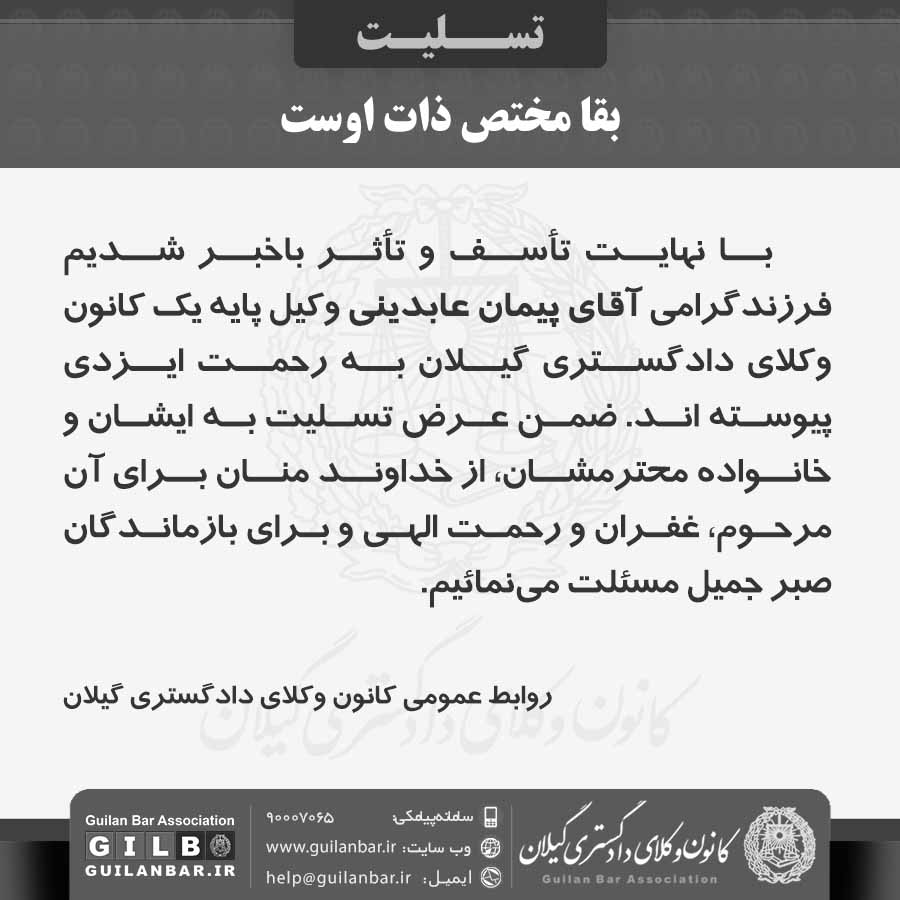 با نهایت تأسف و تأثر باخبر شدیم فرزند گرامی آقای پیمان عابدینی وکیل پایه یک کانون وکلای دادگستری گیلان به رحمت ایزدی پیوسته اند. ضمن عرض تسلیت به ایشان و خانواده محترمشان، از خداوند منان برای آن مرحوم، غفران و رحمت الهی و برای بازماندگان صبر جمیل مسئلت مینمائیم.