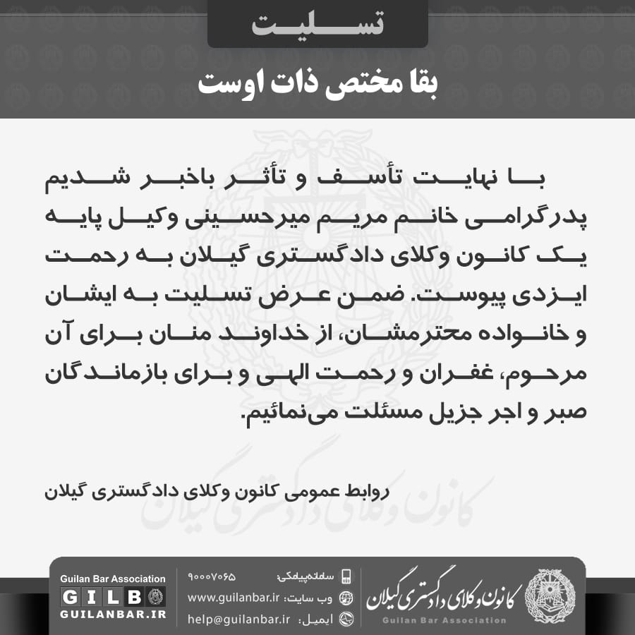 با نهایت تأسف و تأثر باخبر شدیم پدرگرامی خانم مریم میرحسینی وکیل پایه یک کانون وکلای دادگستری گیلان به رحمت ایزدی پیوست. ضمن عرض تسلیت به ایشان و خانواده محترمشان، از خداوند منان برای آن مرحوم، غفران و رحمت الهی و برای بازماندگان صبر و اجر جزیل مسئلت مینمائیم.