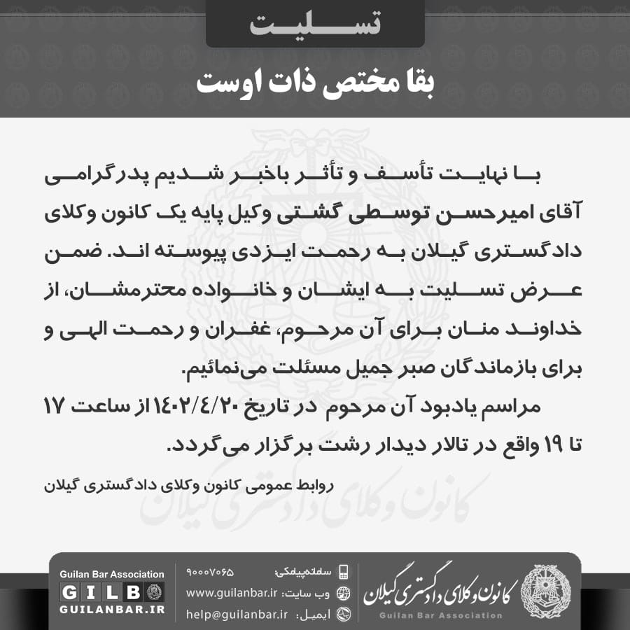 با نهایت تأسف و تأثر باخبر شدیم پدرگرامی آقای امیرحسن توسطی گشتی وکیل پایه یک کانون وکلای دادگستری گیلان به رحمت ایزدی پیوسته اند. ضمن عرض تسلیت به ایشان و خانواده محترمشان، از خداوند منان برای آن مرحوم، غفران و رحمت الهی و برای بازماندگان صبر جمیل مسئلت مینمائیم.
