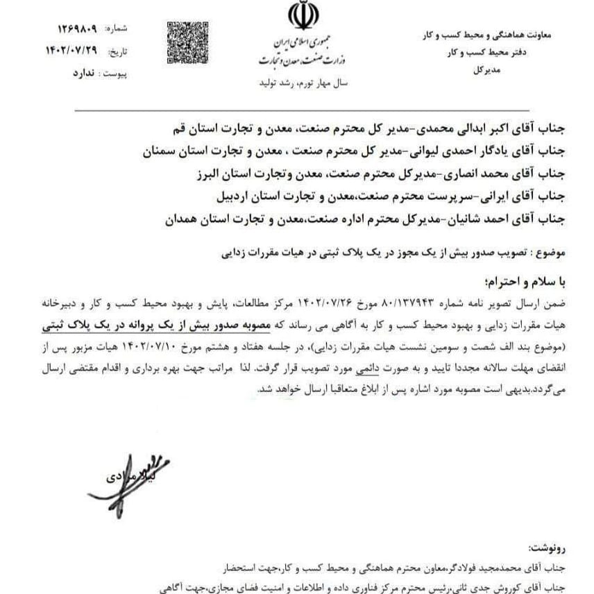 ضمن ارسال تصویر نامه شماره ۸۰/۱۳۷۹۴۳ مورخ ۱۴۰۳/۰۷/۲۶ مرکز مطالعات، پایش و بهبود محیط کسب و کار و دبیرخانه هیات مقررات زدایی و بهبود محیط کسب و کار به آگاهی می رساند که مصوبه صدور بیش از یک پروانه در یک پلاک ثبتی (موضوع بند الف شصت و سومین نشست هیات مقررات زدایی)، در جلسه هفتاد و هشتم مورخ ۱۴۰۲/۰۷/۱۰ هیات مزبور پس از انقضای مهلت سالانه مجددا تایید و به صورت دائمی مورد تصویب قرار گرفت. لذا مراتب جهت بهره برداری و اقدام مقتضی ارسال می گردد. بدیهی است مصوبه مورد اشاره پس از ابلاغ متعاقبا ارسال خواهد شد.