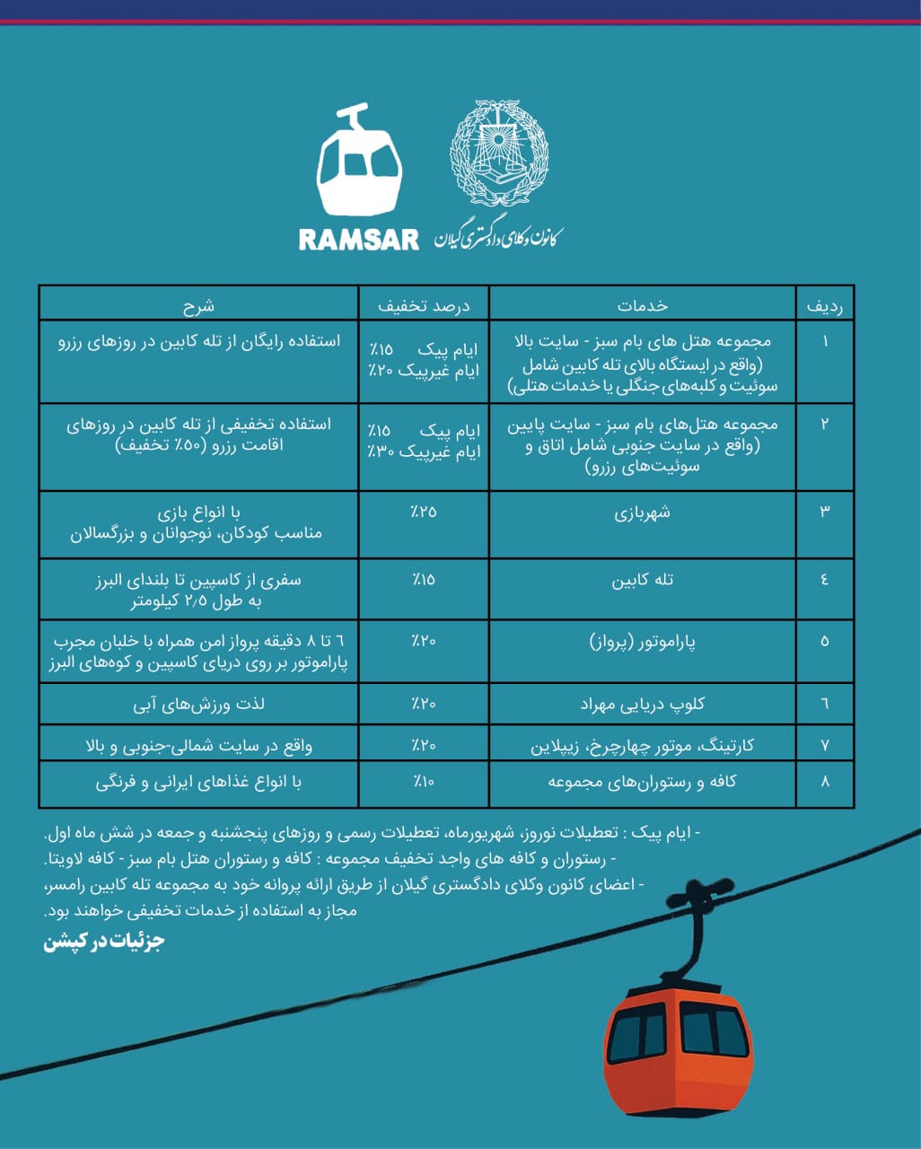 لازم به ذکر است اعضای کانون وکلای دادگستری گیلان از طریق ارائه پروانه خود به مجموعه تله کابین رامسر، مجاز به استفاده از خدمات تخفیفی خواهند بود.