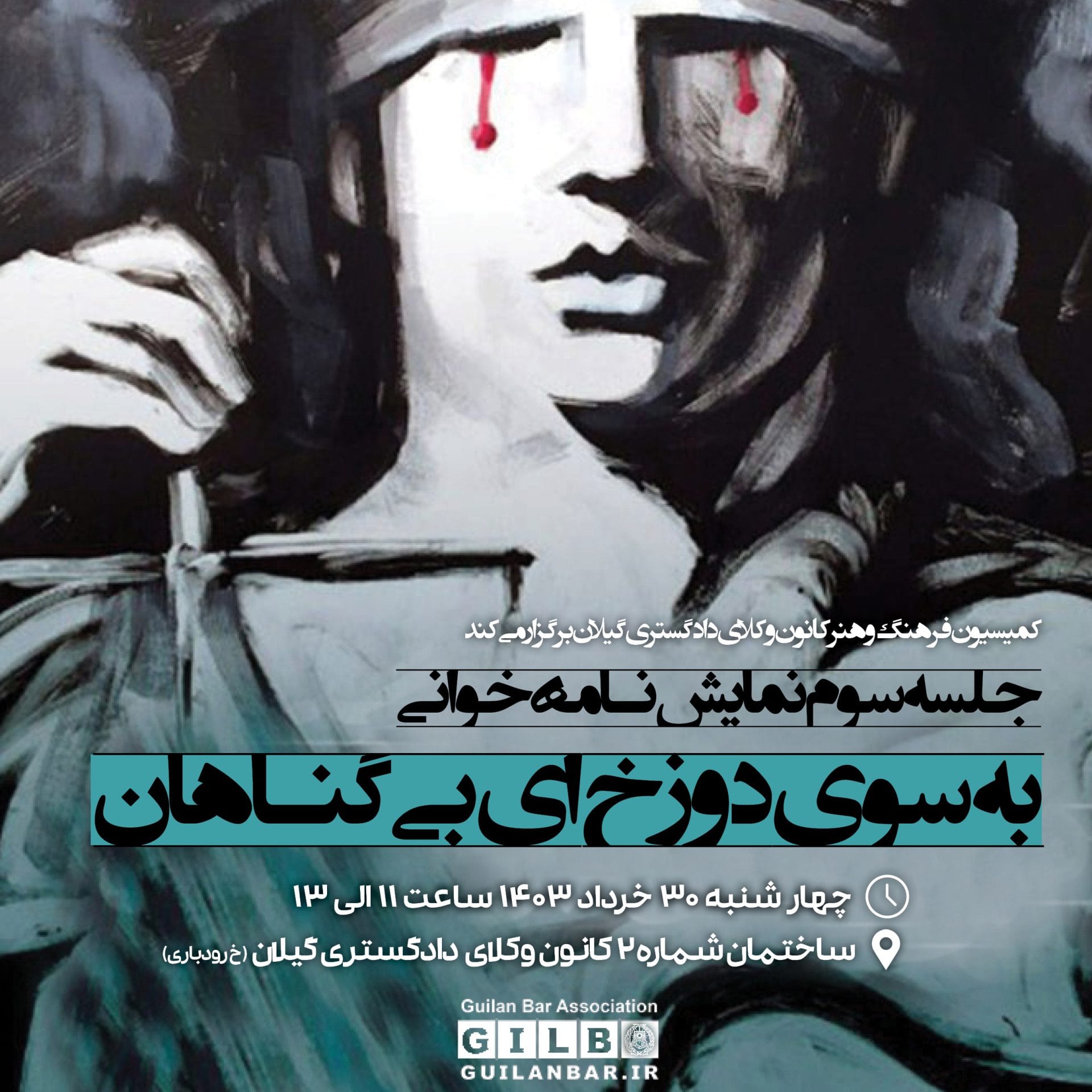 کمیسیون فرهنگ و هنر کانون وکلای دادگستری گیلان جلسه سوم نمایشنامهخوانی به سوی دوزخ ای بیگناهان را برگزار می نماید.