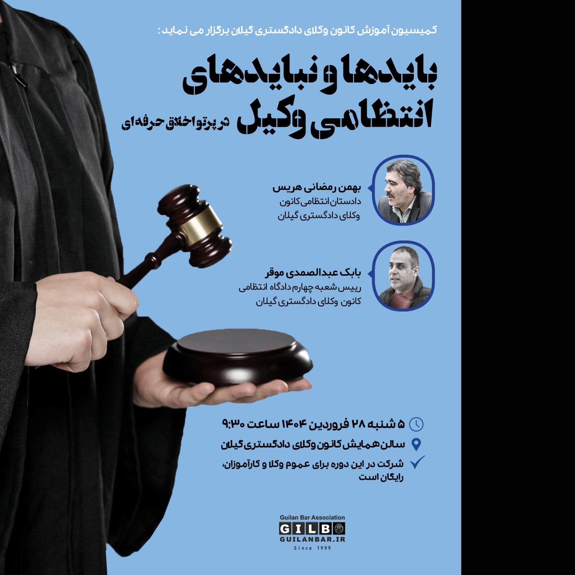 کمیسیون آموزش کانون وکلای دادگستری گیلان در نظر دارد دوره آموزشی بایدها و نبایدهای انتظامی وکیل در پرتو اخلاق حرفهای را با سخنرانی بهمن رمضانی هریس (دادستان انتظامی کانون وکلای دادگستری گیلان) و بابک عبدالصمدی موقر (رییس شعبه چهارم دادگاه انتظامی کانون وکلای دادگستری گیلان) برگزار نماید.