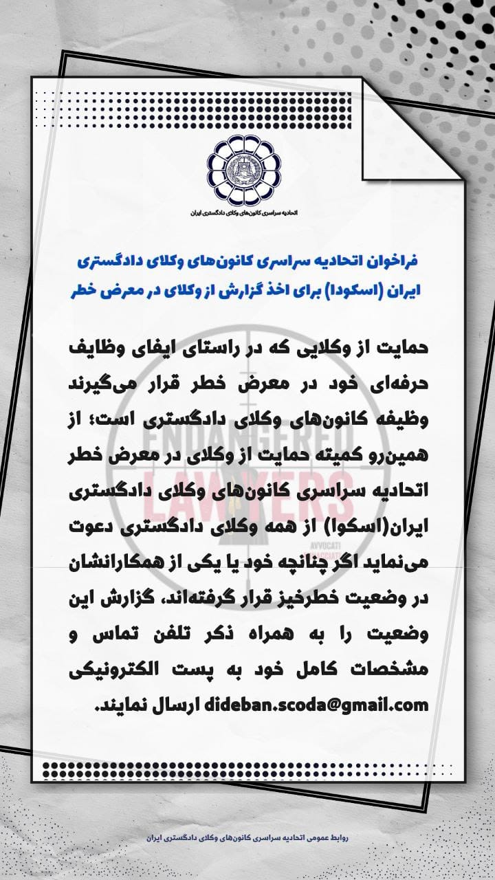 کمیته حمایت از وکلای در معرض خطر اتحادیه سراسری کانونهای وکلای دادگستری ایران(اسکودا) از همه وکلای دادگستری دعوت میکند اگر چنانچه خود یا یکی از همکارانشان در وضعیت خطرخیز قرار گرفتهاند، گزارش این وضعیت را به همراه ذکر تلفن تماس و مشخصات کامل خود به پست الکترونیکی dideban.scoda@gmail.com ارسال نمایند.