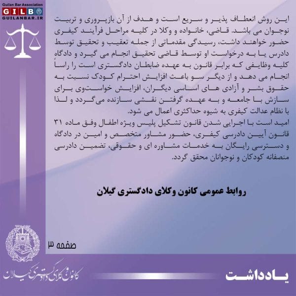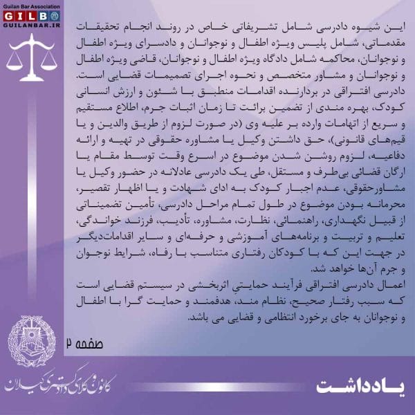 امید است با اجرایی شدن قانون تشکیل پلیس ویژه اطفال وفق ماده ۳۱ قانون آیین دادرسی کیفری، حضور مشاور متخصص و امین در دادگاه و دسترسی رایگان به خدمات مشاوره ای و حقوقی، تضمین دادرسی منصفانه کودکان و نوجوانان محقق گردد.