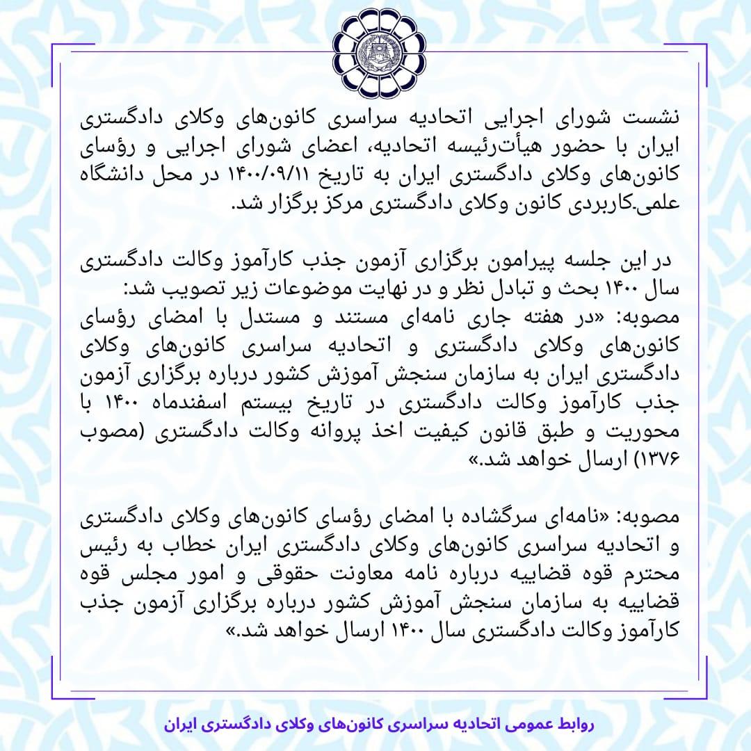 مصوبات شورای اجرایی اتحادیه سراسری کانونهای وکلای دادگستری ایران مورخ ۱۴۰۰/۰۹/۱۱