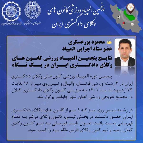 پنجین دوره المپیاد ورزشی کانونهای وکلای دادگستری ایران در ۳ رشته ورزشی فوتسال، والیبال و تنیسروی میز از ۱۸ لغایت ۲۳ اردیبهشت ماه ۱۴۰۱ به میزبانی کانون وکلای دادگستری گیلان در مجتمع تفریحی ورزشی آهوان شهر چابکسر برگزار شد.