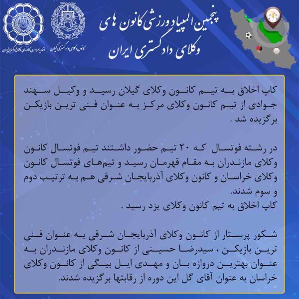 کاپ اخلاق به تیم کانون وکلای گیلان رسید و وکیل سهند جوادی از تیم کانون وکلای مرکز به عنوان فنی ترین بازیکن برگزیده شد .