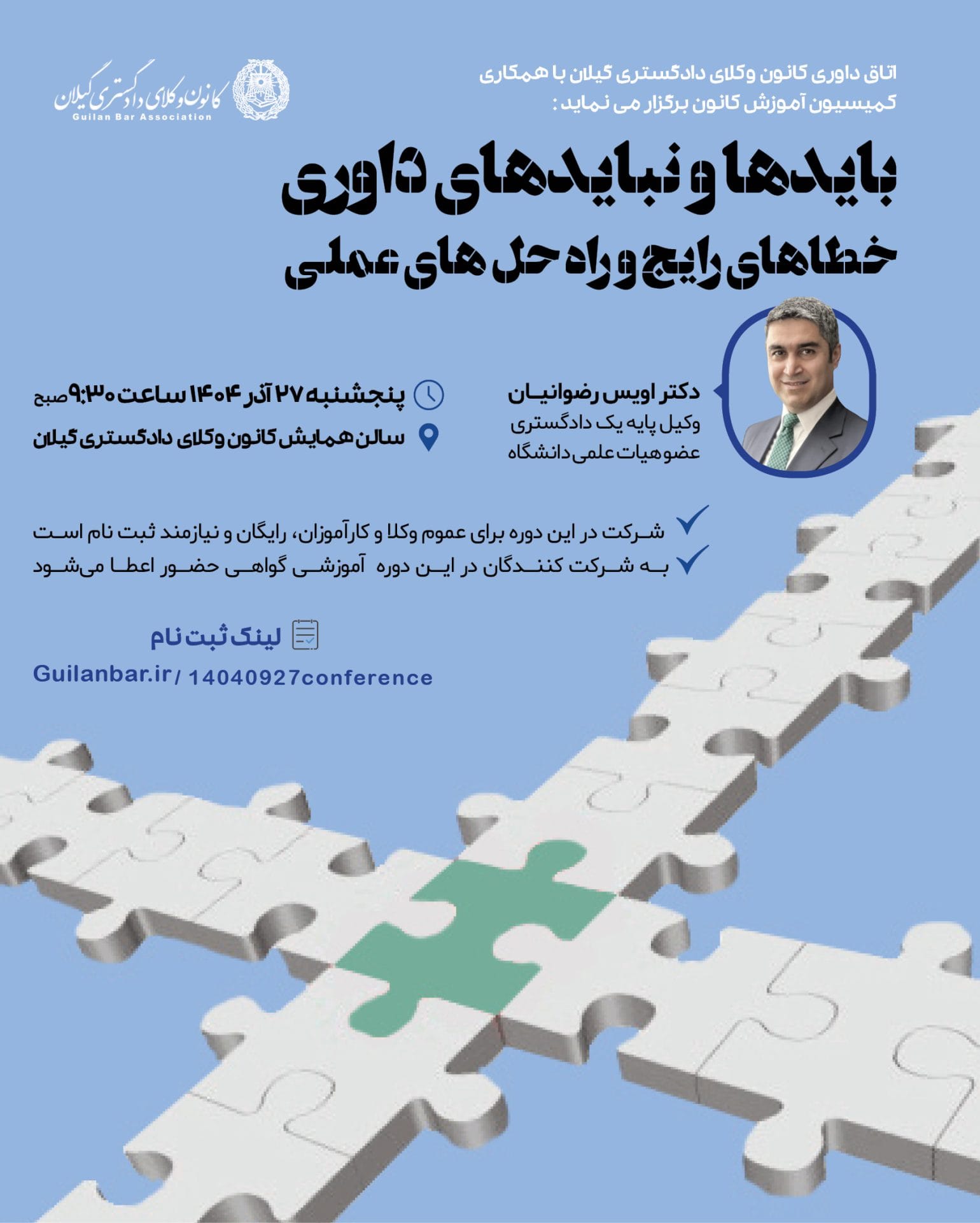 اتاق داوری کانون وکلای دادگستری گیلان با همکاری کمیسیون آموزش کانون دوره آموزشی «بایدها و نبایدهای داوری (خطاهای رایج و راه حل‌های عملی)» را با سخنرانی دکتر اویس رضوانیان فارغ التحصیل دکتری حقوق بین‌الملل از دانشگاه ژنو  و کارشناسی ارشد در داوری تجاری بین‌المللی از دانشگاه استکهلم برگزار می‌نماید.