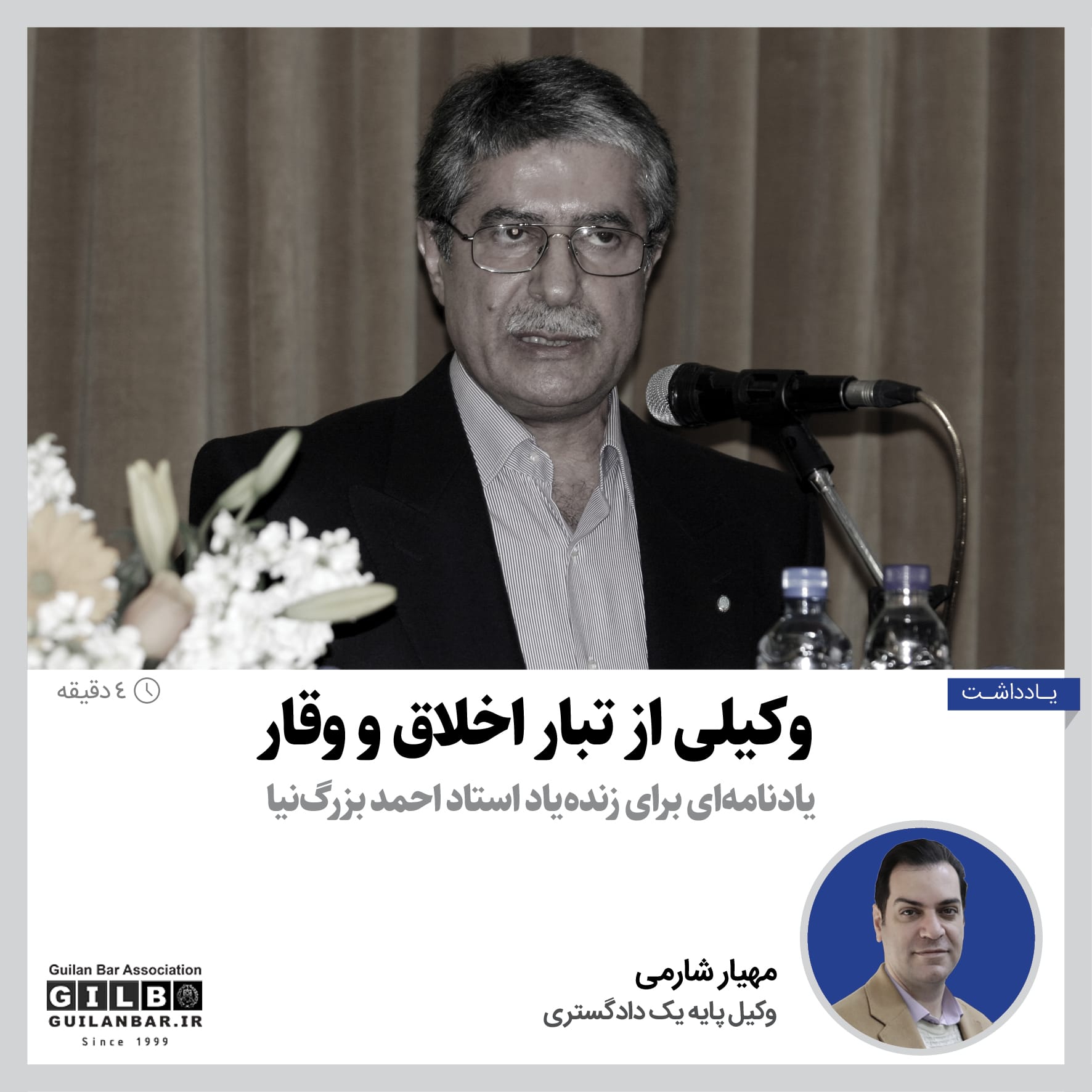این یادنامه، روایت صمیمانه شاگردی است از سالها همنفسی و همراهی و شاگردی با زندهیاد استاد احمد بزرگنیا؛ وکیلی که اخلاق حرفهای، وقار رفتاری و پایبندی به اصول انسانی را نه در گفتار، بلکه در زیست روزمره وکالت معنا میکرد.