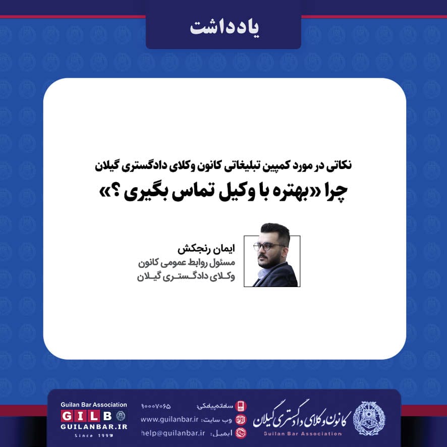 ابتدای پاییز امسال بود که کانون وکلای دادگستری گیلان در دور جدید اقدامات خود برای تقویت و ارتقای سطح فرهنگ عمومی و آگاهی حقوقی شهروندان در مراجعه به موقع نزد وکیل دادگستری حین مواجهه با مشکلات حقوقی- قضایی، طراحی و نصب بنر و بیلبوردهایی برای تبیین این مهم در سطح شهرهای استان گیلان را کلید زد که این طرح تا اینجا در شهرهای رشت، انزلی، تالش، آستارا، فومن، شفت، لاهیجان و لنگرود اجرایی شده است.
