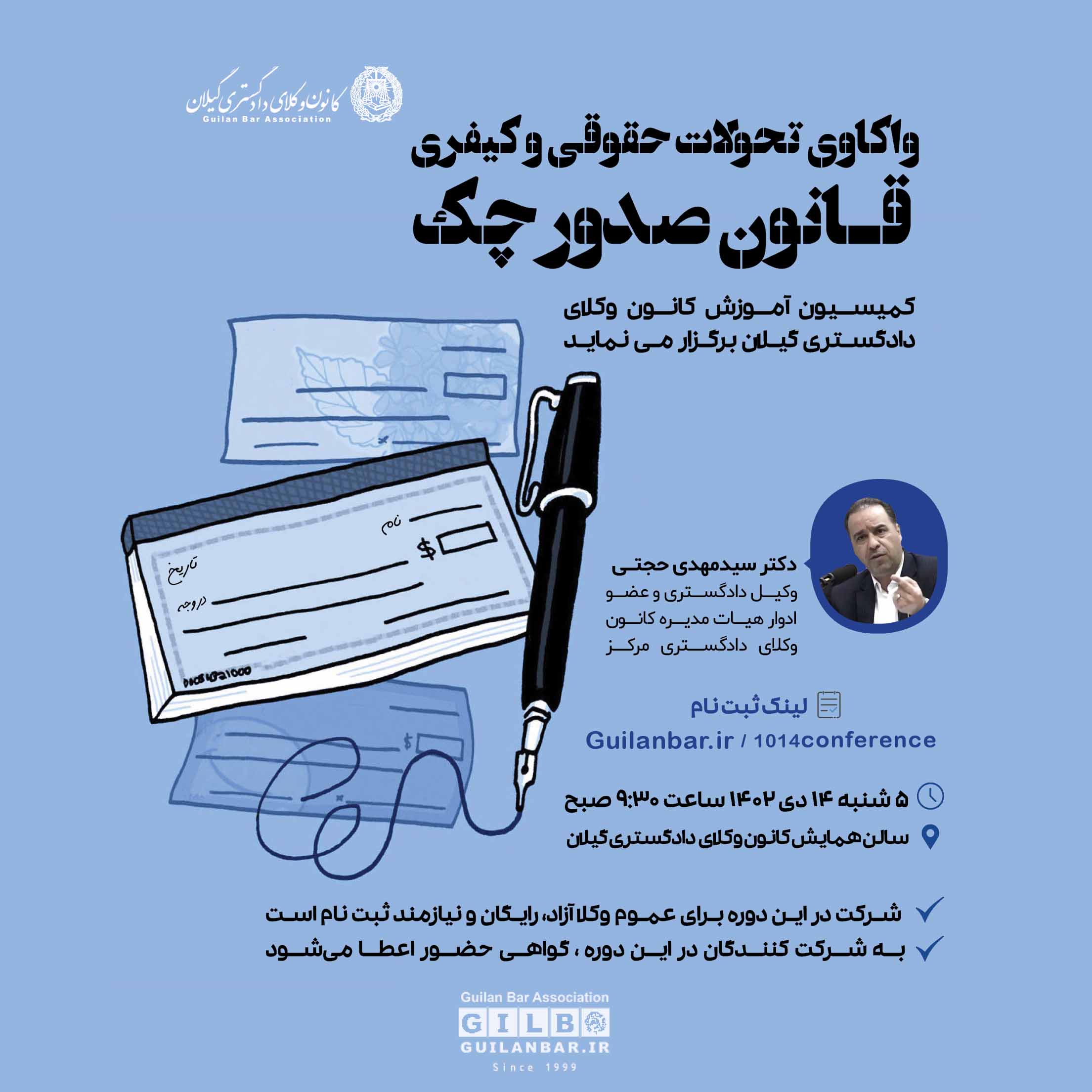 کمیسیون آموزش کانون وکلای دادگستری گیلان یک دوره آموزشی با عنوان «واکاوی تحولات حقوقی و کیفری قانون صدور چک» را با سخنرانی دکتر سیدمهدی حجتی وکیل دادگستری و عضو ادوار هیات مدیره کانون وکلای دادگستری مرکز برگزار می نماید.