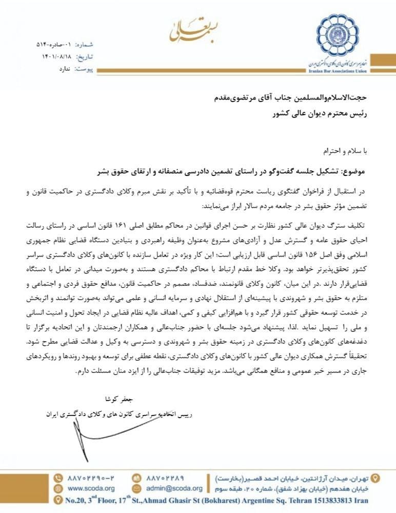 مکاتبه با رئیس دیوان عالی کشور با موضوع گفتگو در راستای دادرسی منصفانه و ارتقای حقوق بشر