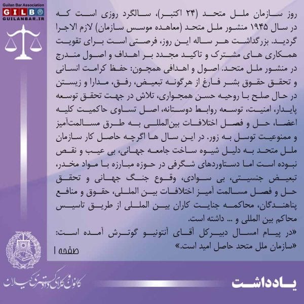 روز سازمان ملل متحد (۲۴ اکتبر)، سالگرد روزی است که در سال ۱۹۴۵ منشور ملل متحد (معاهده موسس سازمان) لازم الاجرا گردید. بزرگداشت هر ساله این روز، فرصتی است برای تقویت همکاری های مشترک و تاکید مجدد بر اهداف و اصول مندرج در منشور ملل متحد. اصول و اهدافی همچون: حفظ کرامت انسانی و تحقق حقوق بشر فارغ از هرگونه تبعیض، رفق، مدارا و زیستن در حال صلح با روحیه حسن همجواری، تلاش در جهت تحقق توسعه پایدار، امنیت، توسعه روابط دوستانه، اصل تساوی حاکمیت کلیه اعضا، حل و فصل اختلافات بینالمللی به طرق مسالمتآمیز و ممنوعیت توسل به زور. در این سال ها اگرچه حاصل کار سازمان ملل متحد به دلیل شیوه ساخت جامعه جهانی، بی عیب و نقص نبوده است اما دستاوردهای شگرفی در حوزه مبارزه با مواد مخدر، تبعیض جنسیتی، بی سوادی، وقوع جنگ جهانی و تحقق حل و فصل مسالمت آمیز اختلافات بین المللی، حقوق و منافع پناهندگان، محاکمه جنایت کاران بین المللی از طریق تاسیس محاکم بین المللی و … داشته است.