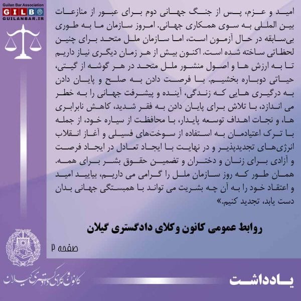 امید و عزم، پس از جنگ جهانی دوم برای عبور از منازعات بین المللی به سوی همکاری جهانی. امروز سازمان ما به طوری بیسابقه در حال آزمون است، اما سازمان ملل متحد برای چنین لحظاتی ساخته شده است. اکنون بیش از هر زمان دیگری نیاز داریم تا به ارزش ها و اصول منشور ملل متحد در هر گوشه از گیتی، حیاتی دوباره بخشیم. با فرصت دادن به صلح و پایان دادن به درگیری هایی که زندگی، آینده و پیشرفت جهانی را به خطر می اندازد، با تلاش برای پایان دادن به فقر شدید، کاهش نابرابری ها، و نجات اهداف توسعه پایدار، با محافظت از سیاره خود، از جمله با ترک اعتیادمان به استفاده از سوختهای فسیلی و آغاز انقلاب انرژیهای تجدیدپذیر و در نهایت با ایجاد تعادل در ایجاد فرصت و آزادی برای زنان و دختران و تضمین حقوق بشر برای همه. همان طور که روز سازمان ملل را گرامی می داریم، بیایید امید و اعتقاد خود را به آن چه بشریت می تواند با همبستگی جهانی بدان دست یابد، تجدید کنیم.»