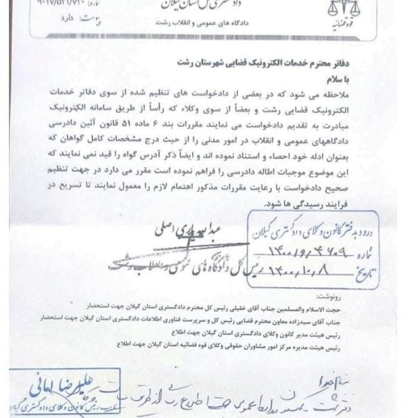 باران نوروزی۱۴۰۰-۱۰-۰۸بخشنامه رئیس کل دادگاه های عمومی و انقلاب رشت با موضوع ضرورت تنظیم صحیح دادخواست با رعایت مقررات قانونی از ... ادامه مطلبادامه مطلب