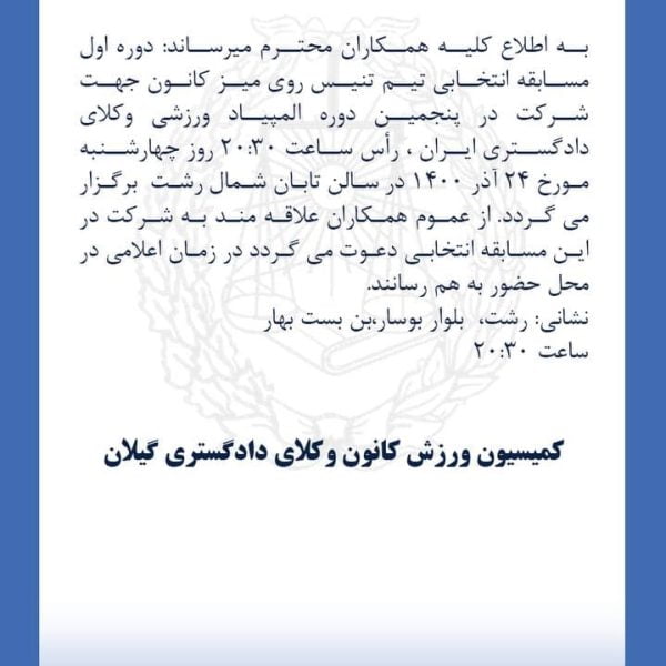 اطلاعیه کمیسیون ورزش کانون وکلای دادگستری گیلانباران نوروزی۱۴۰۰-۰۹-۱۵قابل توجه علاقمندان به رشته ورزشی تنیس روی میز به اطلاع کلیه همکاران محترم میرساند: دوره اول مسابقه انتخابی تیم ... ادامه مطلب
