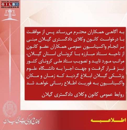انجام واکسیناسیون عمومی همکاران عضو کانونشالکوئی۱۴۰۰-۰۵-۱۵به آگاهی همکاران محترم میرساند پس از موافقت با درخواست کانون وکلای دادگستری گیلان مبنی بر انجام واکسیناسیون عمومی همکاران ... ادامه مطلب