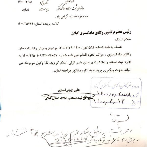 تصویر مکاتبات ریاست محترم کانون وکلای دادگستری گیلان با مدیر کل محترم محترم ثبت اسناد و املاک استان گیلان در خصوص پذیرش وکالتنامه های وکلای دادگستری در دفاتر اسناد رسمی و اداره ثبت اسناد و املاک شهرستان بندر انزلیشالکوئی۱۴۰۰-۰۴-۱۵