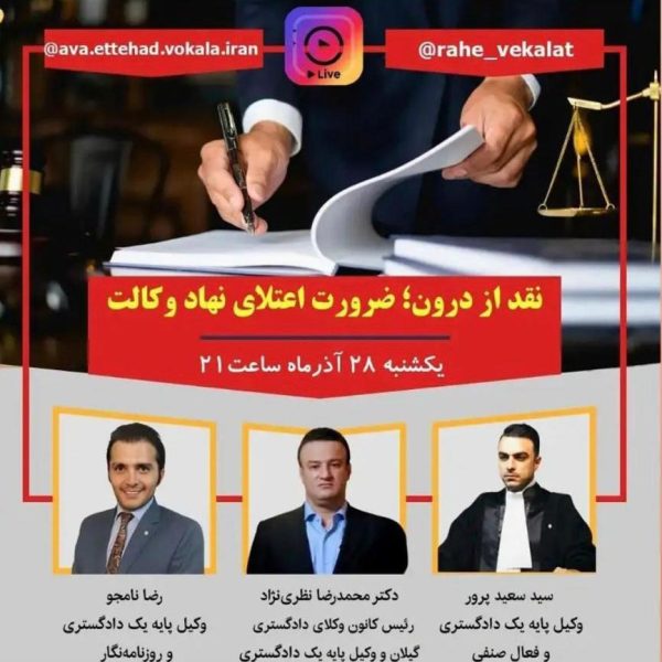 «نقد از درون؛ ضرورت اعتلای نهاد وکالت»باران نوروزی۱۴۰۰-۰۹-۲۸📅زمان: یکشنبه ۲۸ آذرماه 🕰ساعت ۲۱ ⭕️ با حضور: 👤دکتر محمدرضا نظری نژاد رئیس کانون وکلای دادگستری گیلان و وکیل ... ادامه مطلب