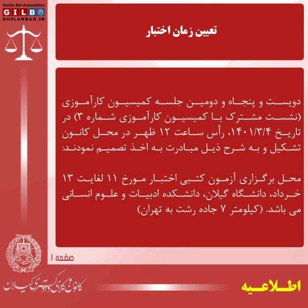 زمان و مکان آزمون اختبارایمان رنجکش۱۴۰۱-۰۳-۰۵زمان و مکان آزمون اختبار روابط عمومی کانون وکلای دادگستری گیلان ... ادامه مطلب