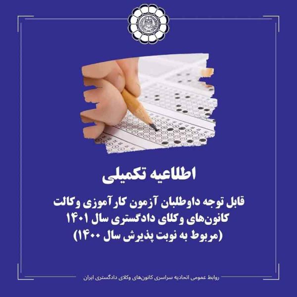 اطلاعیه تکمیلیایمان رنجکش۱۴۰۱-۰۳-۰۳قابل توجه داوطلبان آزمون کارآموزی وکالت کانون های وکلای دادگستری سال ۱۴۰۱ (مربوط به نوبت پذیرش سال ۱۴۰۰) روابط ... ادامه مطلب