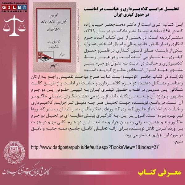 📚 معرفی کتاب: تحلیل جرایم کلاه برداری و خیانت در امانت در حقوق کیفری ایرانسجاد خان میرزائی۱۴۰۱-۰۹-۰۶این کتاب، اثری است از دکتر محمدجعفر حبیب زاده که در ۵۶۸ صفحه توسط نشر دادگستر در سال ۱۳۹۹، منتشرگردیده ... ادامه مطلب