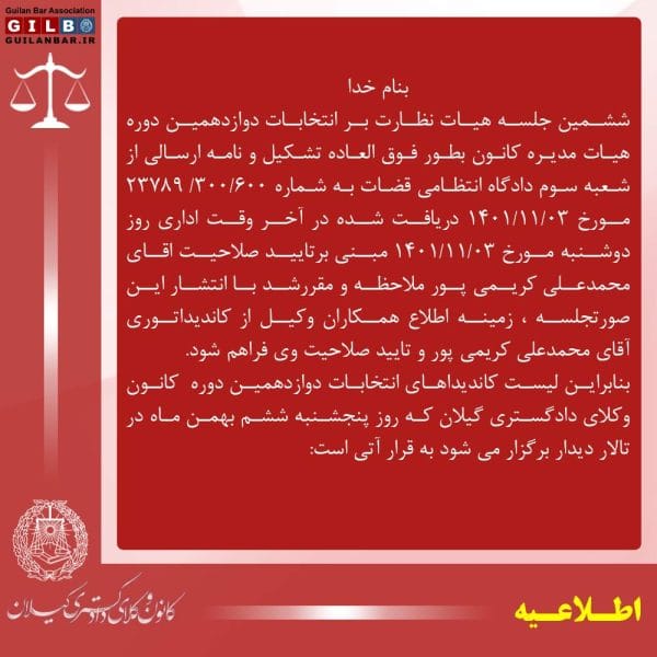 ششمین جلسه هیات نظارت بر انتخابات دوازدهمین دوره هیات مدیره کانونسجاد خان میرزائی۱۴۰۱-۱۱-۰۳بنام خدا ششمین جلسه هیات نظارت بر انتخابات دوازدهمین دوره هیات مدیره کانون بطور فوق العاده تشکیل و نامه ارسالی ... ادامه مطلب