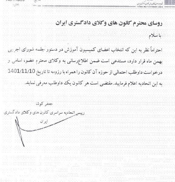 اعلام داوطلبی عضو نماینده کمیسیون آموزش اسکوداسجاد خان میرزائی۱۴۰۱-۱۱-۰۱روسای محترم کانون های وکلای دادگستری ایران با سلام احتراما نظر به این که انتخاب اعضای کمیسیون آموزش در دستور ... ادامه مطلب