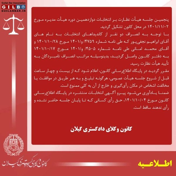 پنجمین صورتجلسه هیات نظارت بر دوازدهمین انتخابات هیات مدیرهسجاد خان میرزائی۱۴۰۱-۱۱-۰۲پنجمین جلسه هیأت نظارت بر انتخابات دوازدهمین دوره هیأت مدیره مورخ ۱۴۰۱/۱۱/۰۲ در محل کانون تشکیل گردید. با توجه به ... ادامه مطلب
