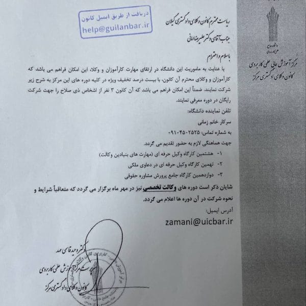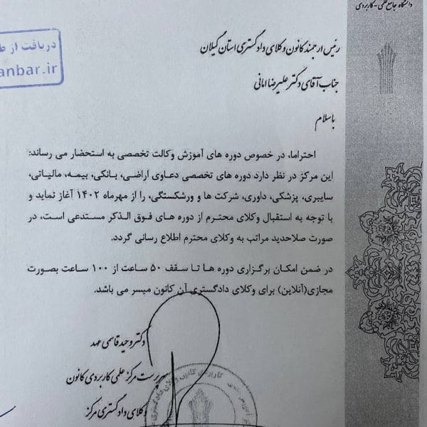 اطلاعیه برگزاری دوره «وکالت تخصصی» توسط مرکز آموزش علمی کاربردی کانون وکلای دادگستری مرکزایمان رنجکش۱۴۰۲-۰۷-۱۹مرکز آموزش علمی کاربردی کانون وکلای دادگستری مرکز طی نامهای به کانون وکلای دادگستری گیلان از برگزاری دورههای «وکالت تخصصی» ... ادامه مطلب