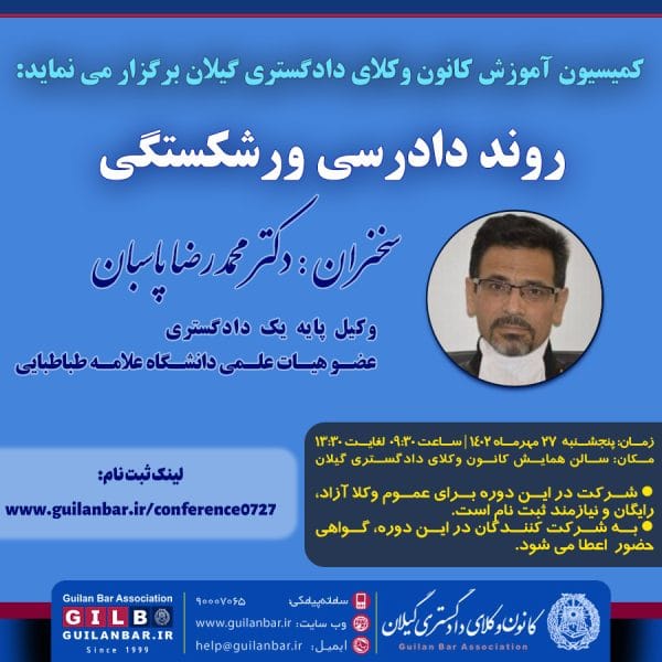 کمیسیون آموزش کانون وکلای دادگستری گیلان برگزار می کند: روند دادرسی ورشکستگیایمان رنجکش۱۴۰۲-۰۷-۲۰روند دادرسی ورشکستگی با سخنرانی دکتر محمدرضا پاسبان وکیل پایه یک دادگستری و عضو هیات علمی دانشگاه علامه طباطبایی زمان ... ادامه مطلب