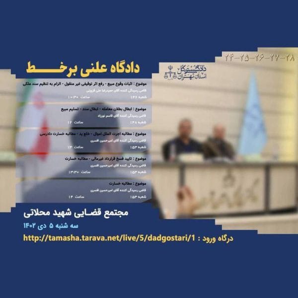 امروز / برگزاری ۵ دادگاه علنی برخطایمان رنجکش۱۴۰۲-۱۰-۰۵در روزسه شنبه ۵ دی ۱۴۰۲، پنج دادگاه علنی برخط در شعب دادگاه عمومی حقوقی مجتمع قضایی شهید محلاتی برگزار ... ادامه مطلب