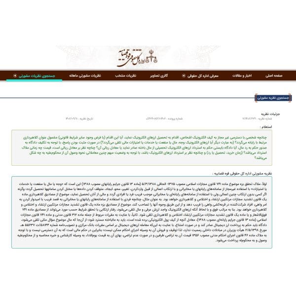 نظریه مشورتی اداره کل حقوقی قوه قضاییه در خصوص دسترسی غیرمجاز به کیف پول الکترونیکایمان رنجکش۱۴۰۲-۱۰-۰۶شماره نظریه : ۷/۱۴۰۲/۶۷۹ شماره پرونده : ۱۴۰۲-۱۸۶/۱-۶۷۹ک تاریخ نظریه : ۱۴۰۲/۰۹/۱۱ استعلام : چنانچه شخصی با دسترسی غیر مجاز ... ادامه مطلب