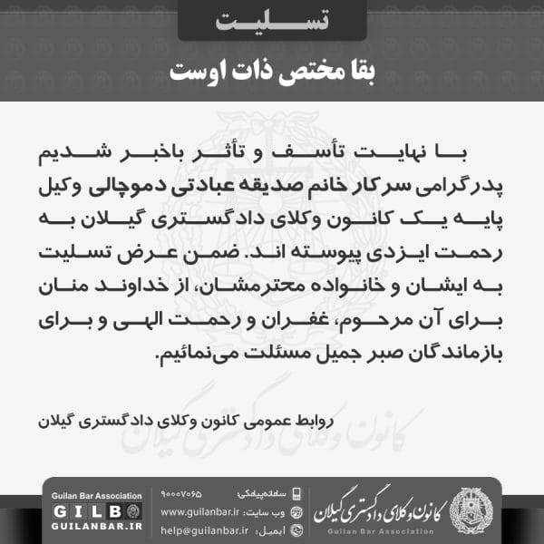 با نهایت تأسف و تأثر باخبر شدیم پدر گرامی سرکار خانم صدیقه عبادتی دموچالی وکیل پایه یک کانون وکلای دادگستری ... ادامه مطلب